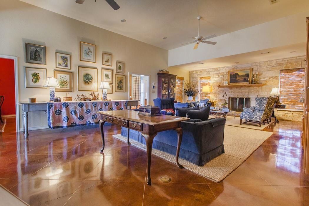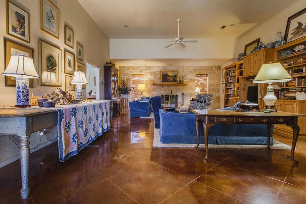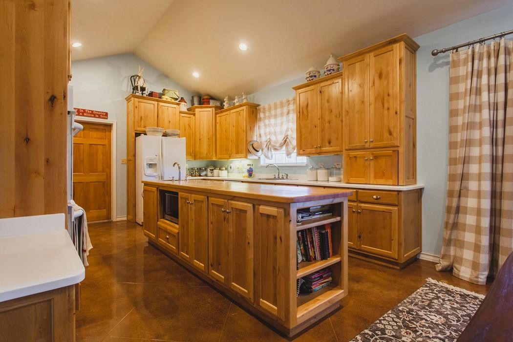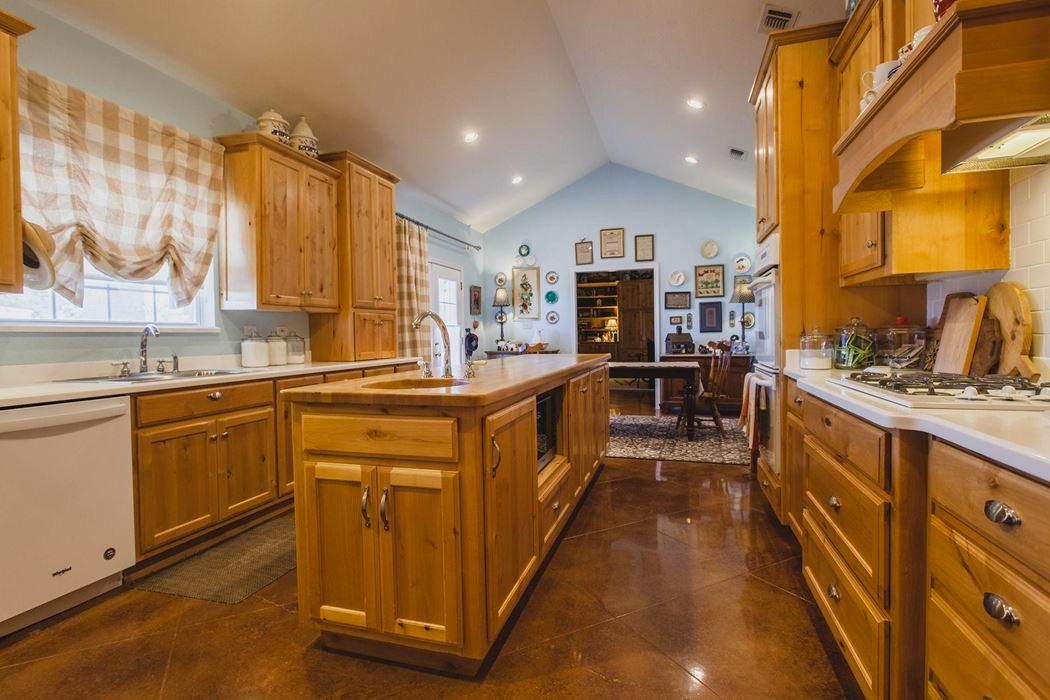 The home features 3 bedrooms, 2.5 baths, and an attached two-car garage. The well-designed floor plan includes a large kitchen/breakfast area adjacent to a very large living room with a wood burning fire place. There is a formal dining room, a butler's pantry, an office, and a separate laundry room. Amenities include knotty Alder cabinets, stained concrete floors, tank less water heaters, an office, plantation shutters, wide doorways, ADA toilets, porches front and back, and lots of built-in bookcases and storage.
