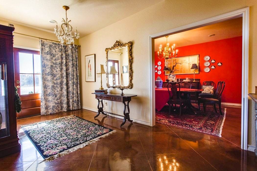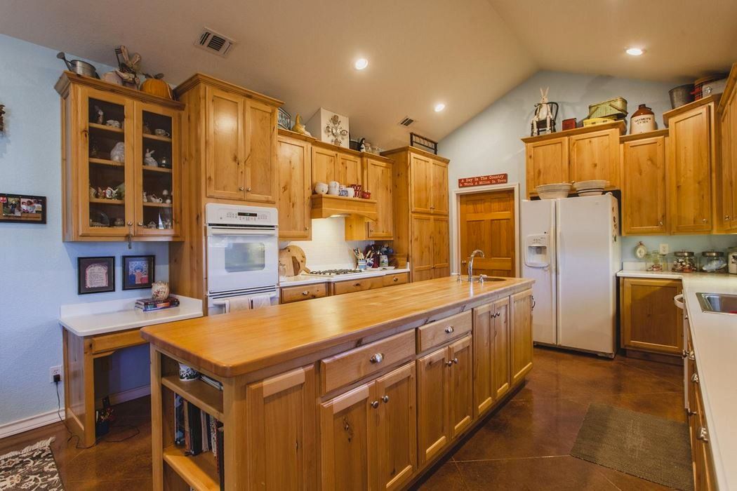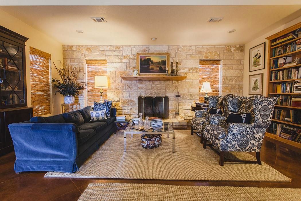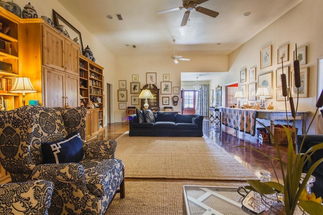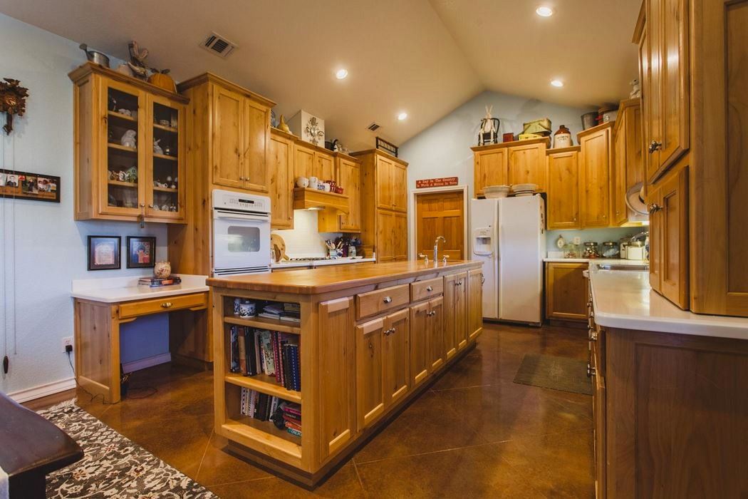 The home features 3 bedrooms, 2.5 baths, and an attached two-car garage. The well-designed floor plan includes a large kitchen/breakfast area adjacent to a very large living room with a wood burning fire place. There is a formal dining room, a butler's pantry, an office, and a separate laundry room. Amenities include knotty Alder cabinets, stained concrete floors, tank less water heaters, an office, plantation shutters, wide doorways, ADA toilets, porches front and back, and lots of built-in bookcases and storage.